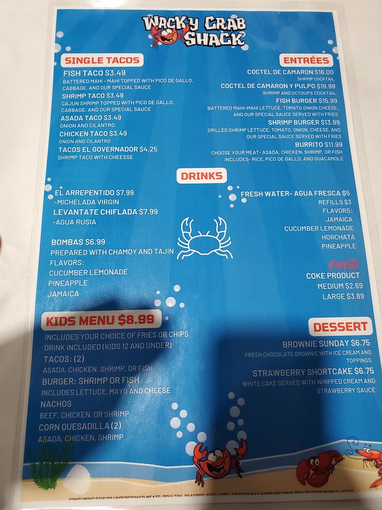 Introducing the menu of Wacky Crab Shack, where seafood lovers can dive into a vibrant blend of Cajun and Creole flavors. Located in Union Gap, WA, this eatery offers an eclectic mix of dishes that celebrate the bounty of the ocean. Highlights include mouthwatering Shrimp Tacos and Fish Tacos, each freshly made and bursting with flavor at just $16. For something different, try the savory Queso Birria Tacos or the intriguing Tacos de Pulpo, both offering a unique twist on classic fare.